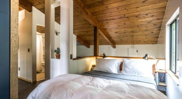 Размеры летнего домика - 6X6 м. В нем два этажа, но при этом три уровня. Внизу находятся гостиная и кабинет. Четыре ступени вверх приведут в зону кухни и столовой. Отсюда по компактной лестнице можно подняться на верхний этаж, площадь которого разделена на хозяйскую спальню, детскую и мини-ванную. В результате переделки в доме оборудовали полноценную современную кухню, а также организовали 6 (!) спальных мест: два не первом этаже и четыре на втором. Интересно, что изначально между спальнями отсутствовала дверь - комнаты плавно перетекали друг в друга.