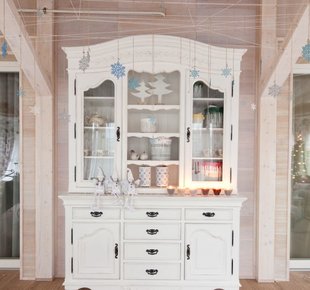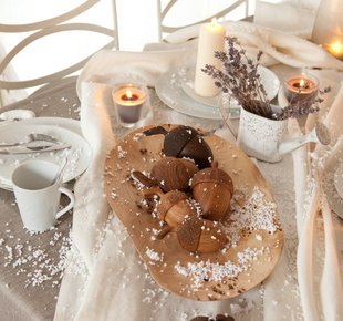 Здесь хорошо освежиться, но замерзнуть - едва ли удастся. Веранда белым-бела, как и сугроб за окном. Это новогодняя зона свежести для разгоряченных гостей, а также для тех, кто не решился выйти на улицу, но не прочь ощутить чарующий контраст зимней стужи и чашки горячего чая Стол декорирован выполненными из дерева желудями и веточками лаванды. Букет из веток расцвечен нарядными елочными игрушками, украшенными искусной росписью