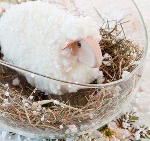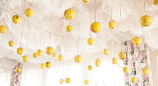 В «царстве Снежной королевы» морозцем не тронуты лишь яблоки. Они настоящие и подвешены на нити под потолком над столовой зоной. Маленькие барашки в вазах напоминают о рождественском чуде.