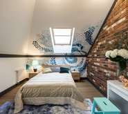 Такое нестандартное решение в проекте не единственное. Креативно подошли к потолкам: часть их покрыли прозрачным лаком по штукатурке вместо покраски — получилось легко и как раз в лофтовом настроении. В детской, по желанию самого младшего заказчика, появилась оригинальная роспись на морскую тематику.