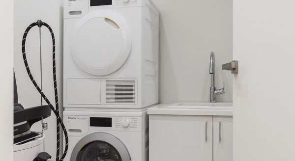Хозяйственные вещи, бытовую химию убрали в отдельную постирочную. Для одежды спроектировали гардеробную и шкафы. Все системы хранения скрыли за фасадами, максимально близкими к цвету стен. Остались только открытые полки для декора и сувениров.