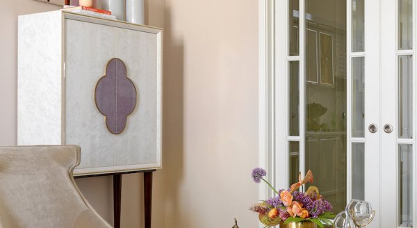 «Очень медленно и методично я меняла представление заказчиков о спокойных оттенках, вводя тонкие цветовые сочетания, разбавляя хромовые детали золотистыми», — рассказывает Марина. Персиковый тон стен оттенён, помимо золотистого, сливовым, сиреневым, оранжевым, цветом морской волны.