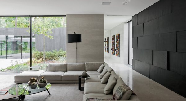Благодаря тому что в отделке фасадов и внутреннего пространства использованы одни и те же материалы, экстерьер и интерьер представляют собой единое целое. «В отличие от дизайнеров мы работаем архитектурно, формируем объём, — продолжает Александра. — Материалы (реечные панно, чёрный сланец, керамогранит и металл) с наружных стен плавно переходят внутрь дома, стирая границы между внешним и внутренним. Таким образом, создаётся оболочка, готовая основа, которая фактически не нуждается ни в каком дополнительном украшательстве. Поставь мебель, повесь светильники, положи ковры, немного аксессуаров — и всё, интерьер выглядит законченным». Строгое, лаконичное сооружение, наполненное светом, можно с лёгкостью представить где‑нибудь в Европе или Америке. Современная концептуальная архитектура, панорамное остекление, игра фактур.