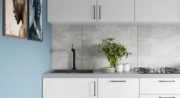 Стены во всех помещениях, кроме ванной, покрасили краской Little Greene. Для гостиной и кухни выбрали сочетание голубого цвета с белым, а для детской — более теплый бежевый оттенок. Стену за телевизором в гостиной декорировали молдингами и зеркалами — такой прием зрительно расширяет пространство. На пол по всей квартире уложили ламинат. Кухонный фартук оформили плиткой Italon — она красиво оттеняет лаконичные белые фасады.