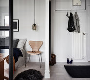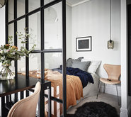 Как бы мала не была квартира, у нее всегда найдется парочка бонусов и преимуществ. В этой, со скромной площадью в 26 квадратных метров, их сразу несколько. Главный «козырь» квартиры — альков, предусмотренный планировкой. В нем декораторам шведского агентства Entrance makleri удалось организовать спальное место, обособив его прозрачной перегородкой. Готовая «спальня» вмещает кровать и стул, на который можно сложить вещи.
