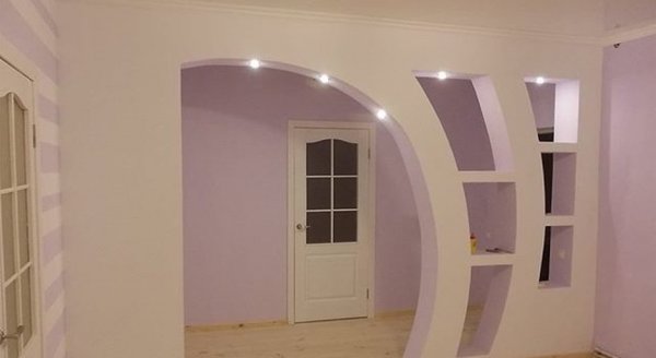 Гипсокартон создает широкий простор для творчества: опытные мастера делают арки любой конфигурации, встраивая в них самые разные отделочные материалы, кроме тяжелых, из-за которых готовое сооружение может завалиться.