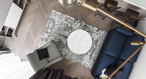 Приглушенные оттенки в сочетании с теплыми металлами очень популярны в проектах Индре. Этот интерьер построен на оттенках серого с синим. Чтобы сдержанная палитра не выглядела скучной, Индре включила ее в обстановку при помощи графичных паттернов и фактурных тканей.