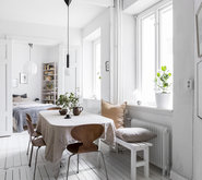 Квартира площадью 42 квадрата досталась им с неплохими исходными данными: трехметровыми потолками, множеством скошенных, но удобных для работы углов и четырьмя большими окнами. Плюс к моменту ремонта в квартире имелись дощатые полы, которые потом покрыли белой краской в тон стенам. Все это уже предполагало сходство с просторным шведским домом в провинции.