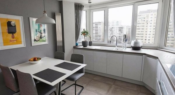 В некоторых панельных домах в кухне есть эркер — например, в некоторых двушках П-44Т. Казалось бы, ничего плохого в этом нет, но как обыграть эту особенности планировки? Можно «продлить» столешницу с раковиной, оборудовать обеденную группу в эркере или просто оформить его в стиле всей кухни.