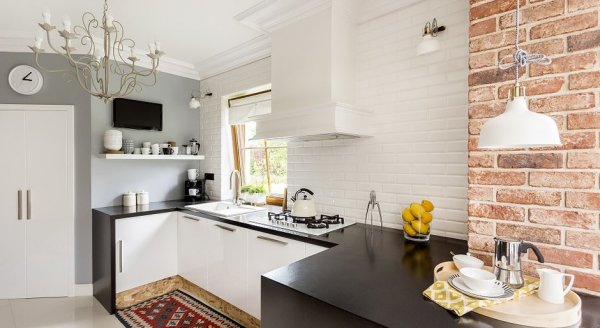 Одно из главных преимуществ такого использования пространства — можно по максимуму задействовать полезную площадь. Поэтому так оформляют кухонные помещения в маленьких квартирах, например в хрущёвках.