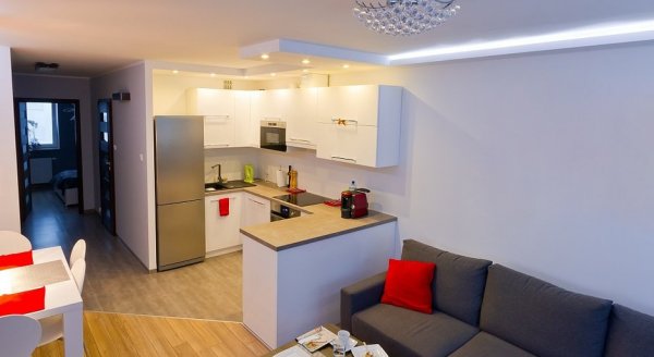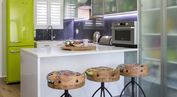 Ещё один случай, когда выбирают такой тип размещения, — это совмещённая кухня-гостиная или квартира-студия. В этом случае можно продлить гарнитур барной стойкой, которая будет зонировать пространство, а заодно выполнит роль обеденного стола.