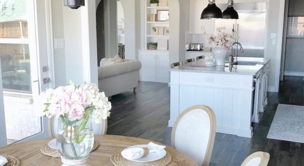 Даже если вы не ждете гостей и не собираетесь обедать, не оставляйте стол в кухне пустым. Пусть на нем будут сервированные салфетки и стоят букеты с цветами, вазочки с печеньем или конфетами — это сделает вашу кухню уютной. Сейчас актуальны льняные и хлопковые салфетки, так что рекомендуем отказаться от привычного пластика.