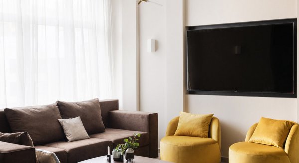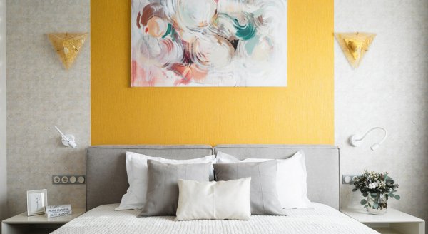 Этот интерьер — холостяцкий. Однако вы не увидите здесь темных стен, бетонных поверхностей и лофтовых аксессуаров. Вместо этого дизайнеры сделали ставку на светлую цветовую палитру, золотые и желтые акценты и максимально удобную мебель. Смотрим, что получилось.