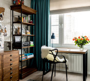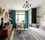 В декоре важное место заняла тема «Алисы в Стране чудес»: дизайнер использовала именно этот сюжет в картине на кухне и постере в ванной. Текстиль добавил уюта и помог создать нужное настроение: например, в спальне заказчицы светлые шторы уравновесили насыщенный цвет стен, а в комнате дочери — яркие оттенки сделали интерьер девичьим.