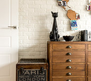«Отделочные материалы в этом проекте довольно бюджетные. Плитка на полу в кухне и прихожей — Kerama Marazzi, на полу в остальных помещениях — ламинат Quick-Step», — рассказывает дизайнер. Заказчице нравится стиль лофт: конечно, можно было бы использовать красный или коричневый кирпич, но он сделал бы небольшие комнаты темнее. Сюда больше подошла белая плитка под кирпич White Hills. В ванной плитку «Гамма» положили елочкой, чтобы она не казалась слишком простой и скучной.