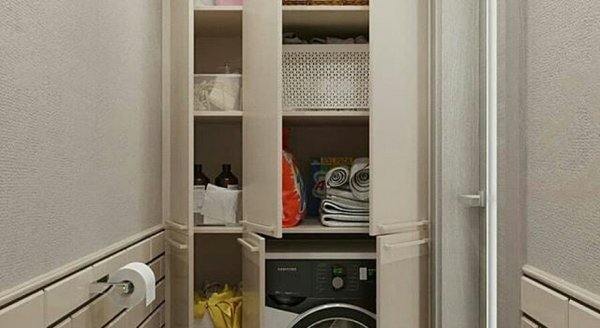 Если у вас раздельный санузел, можно попытаться отыскать место для стиральной машинки в туалете. Посмотрите, как изящно справился дизайнер с этой задачей на примере ниже: во встроенном шкафу нашлось пространство и для бытового агрегата, и для дополнительного хранения.