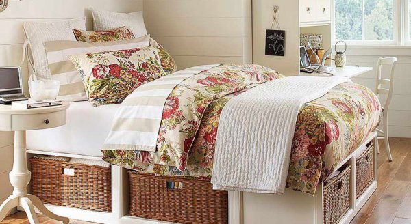 Заполнив шкафы, переходим к другим предметам мебели. Под кроватью отлично могут разместиться коробки и ящики с обувью, одеждой, которую нужно держать поближе, шарфиками, разной мелочёвкой, что вечно лежит где попало. Пуфик — не менее удобное место для того, чтобы убрать с глаз небольшие предметы, детские игрушки, туфельки, справочники...